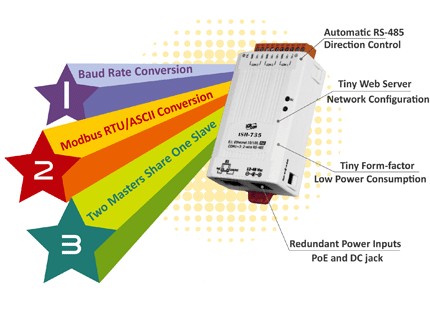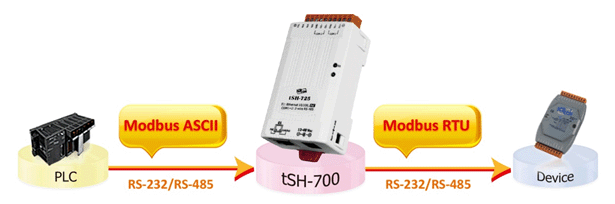 - Modbus RTU/ASCII conversion function: Allow a Modbus RTU/ASCII Master device to communicate with a Modbus RTU/ASCII Slave device with different Protocol, Baud Rate or Data Format.