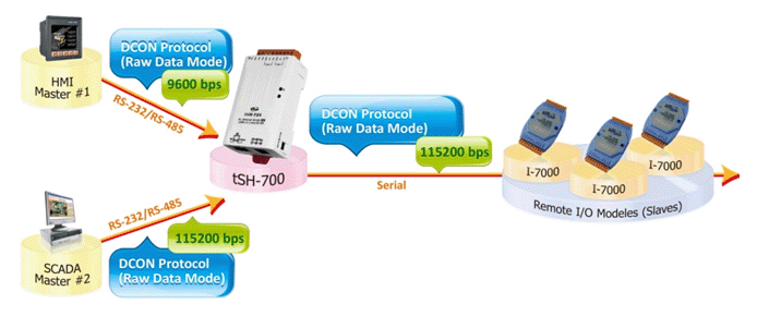 - Baud Rate conversion function: Allow a Master device to communicate with Slave devices with different Baud Rate or Data Format. In the Raw Data mode, it can be applied to most of the half-duplex communications that do not require protocol conversion (Request - Response), such as DCON. When the Data Size is less than 512 bytes buffer size (built-in buffer for each serial port), it can perform full-duplex communication.