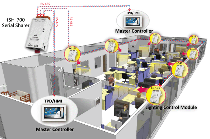 Connect the two uplink serial ports on the tSH-735 module to the two control panels (Master controller such as TPD/HMI) in the front area as well as the back area of the office. And connect the downlink serial port on the tSH-735 module to the lighting control circuit (RS-485 bus). And then the lighting control of the office can be done by using the Master controller (TPD / HMI) in different locations.