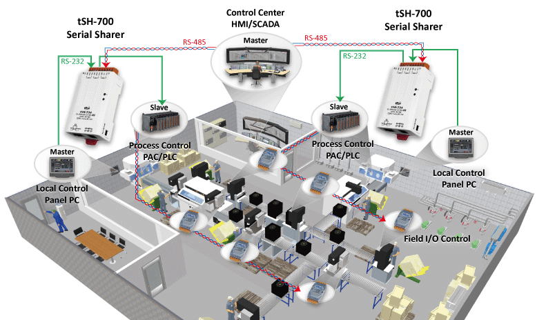 In this production line application, the monitoring & control center (HMI/SCADA) is connected to uplink serial ports on the tSH-734 module of the production line 1 and production line 2 via RS-485. And then the on-site Master controller (Panel PC) of the production line 1 and production line 2 are connected to another uplink serial port on the tSH-734 module via RS-232. Furthermore, the downlink serial port on the tSH-734 module is connected to the slave process controller (PAC/PLC) and then each on-site I/O module can be connected to the RS-485 serial port on the slave process controller (PAC/PLC) to achieve monitoring and control of the production process from the Monitoring & control center or from the on-site controllers.