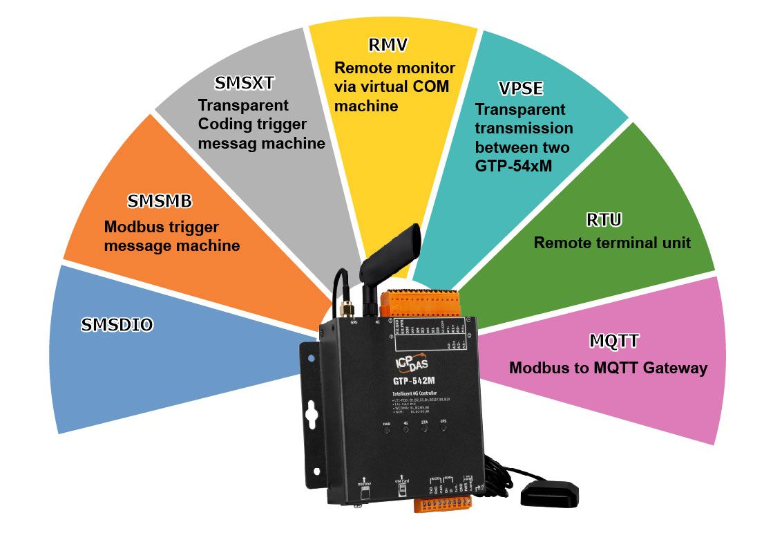 The GTP-541M is an industrial smart 4G remote terminal device that is backward compatible with the 2G/3G frequency band and can be used with different software interfaces to meet user needs. 4G remote terminal equipment transmits I/O signals to the remote management platform through LTE/WCDMA/GPRS. ICP also provides related software support to facilitate customers to quickly establish monitoring programs. These softwares include VxServer. Virtual COM software such as VxComm. In addition, users can switch GTP-541M different functions such as ModBusSMS, DIOSMS and RMV through SD card replacement firmware to meet different application requirements. The powerful features of the GTP-541M reduce user development costs and time, making it ideal for IoT applications.