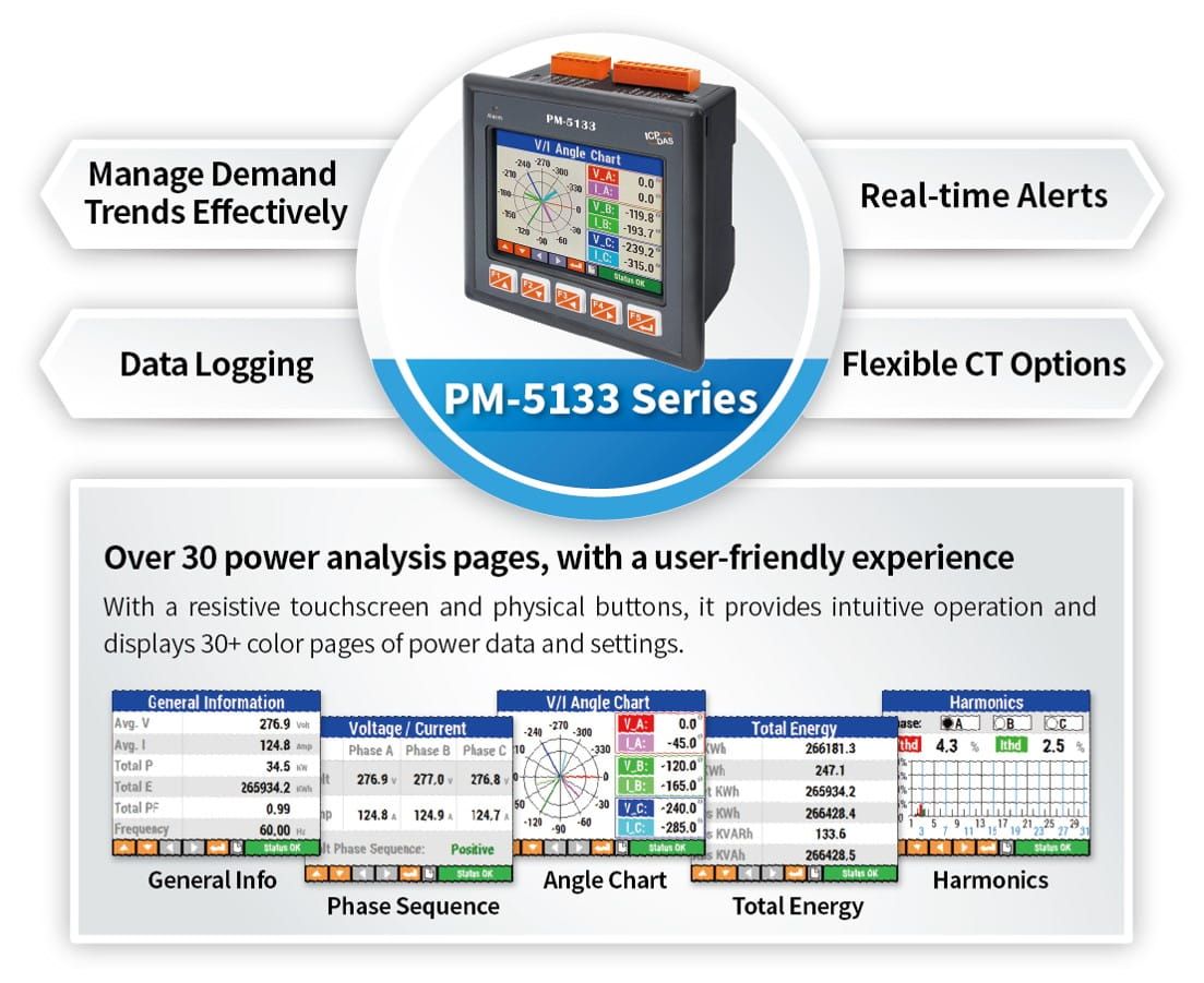 The PM-5133 series is a touch-type 3-phase smart meter designed for industrial automation and energy management. Equipped with a 3.5” high resolution color TFT touch screen, users can intuitively monitor power information and control demand to meet contracted capacity requirements for carbon inventory and ISO-50001 energy management.