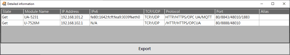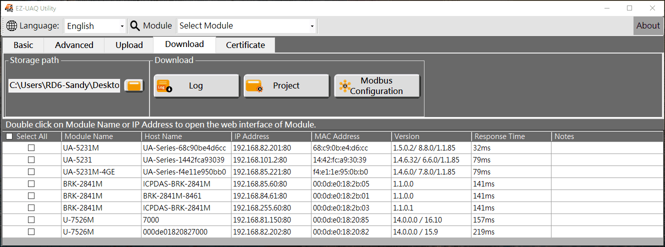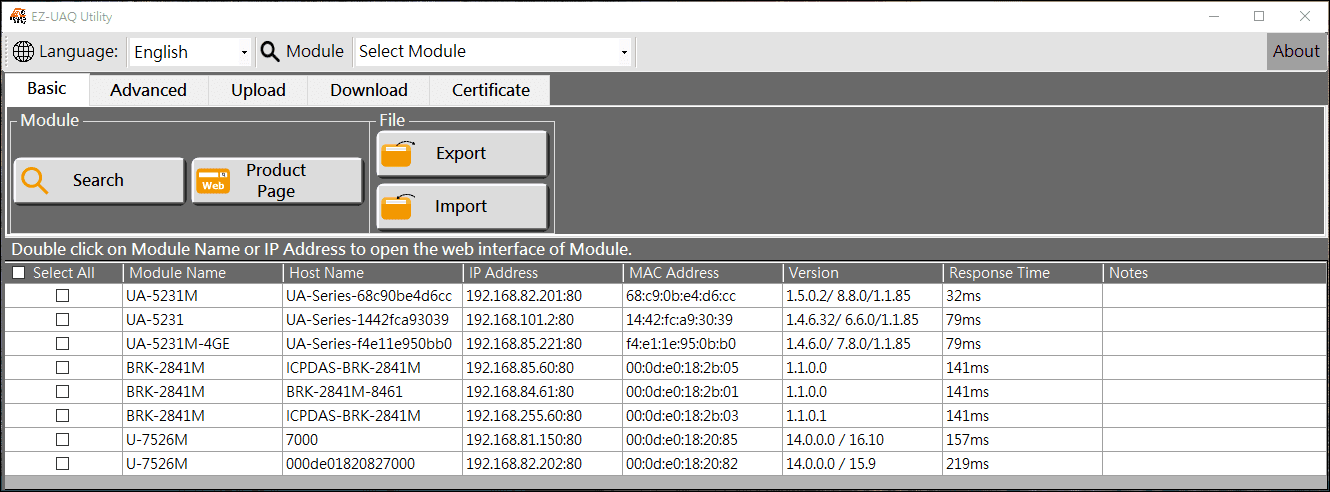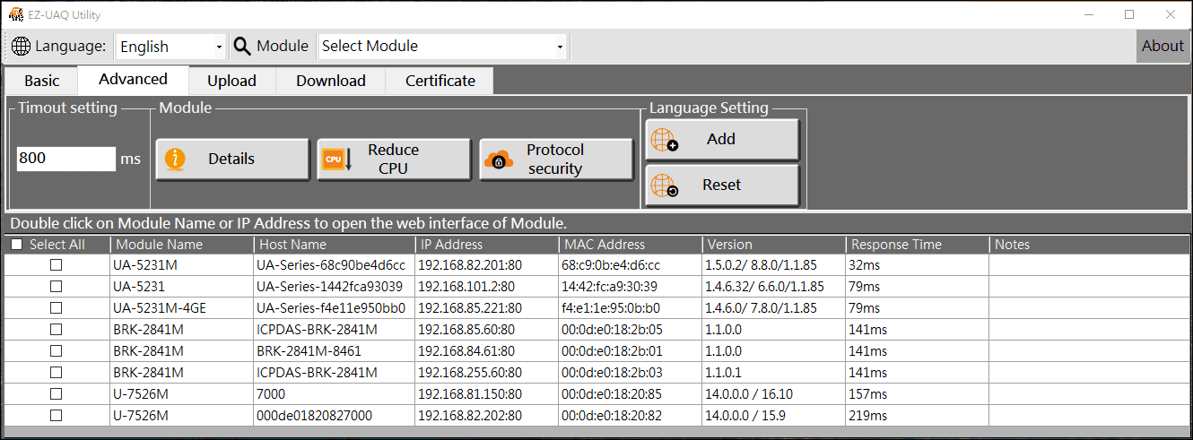 Search for UA communication servers, UA I/O, and BRK series modules in the same or different network segments, and present the Module name, IP Address, MAC Address, version, and response time of each module, which is helpful for field management and troubleshooting.