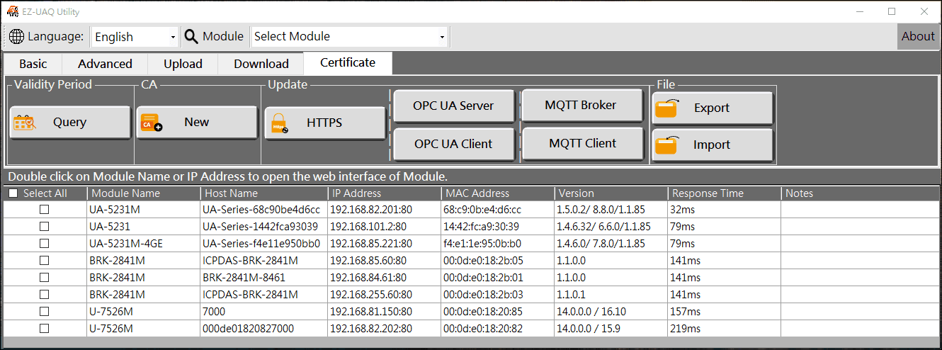 Also, it enhances module management efficiency by supporting Update Firmware, Project Management, Download Log, and Certificate Management, allowing users to quickly configure and maintain HTTPS, OPC UA Server/Client, and MQTT Broker/Client communication security for modules. The EZ-UAQ Utility supports single-unit operations and batch management, allowing for field expansion, maintenance, and staffing changes while ensuring stability, safety, and cost reduction.