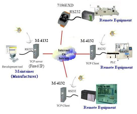 What if engineers can edit and maintain the program through the internet? ICP DAS provides such solutions for this kind of problem. By using the paired £gPAC-7186 PACs, a remote device can be linked to the manufacturer¡¦s computer by internet and let the maintainers diagnose, edit, debug and maintain its program. Even firmware updating is also available!