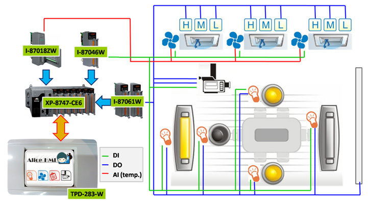 All controls are made through XP-8747-CE6 to read back current temperatures by I-87018ZW, to read back states of air conditioners by I-87046W, and to control the wind speed by I-87061W. |