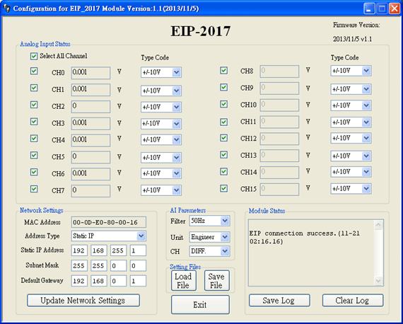 EIP-2017是EtherNet/IP遠端8通道差分輸入類比輸入模組,在經由跳接後可支援16通道單端輸入模組,模組提供電壓及電流的量測,在差分輸入電流量測模式下可支援8個內建電阻(125Ω)供使用者跳接,使用者可以透過LED的顯示狀態得知系統的量測的情況。使用本公司所提供的工具軟體,可以讓使用者透過乙太網路更便利的設置EIP-2000系列產品。