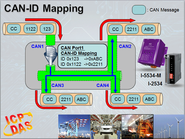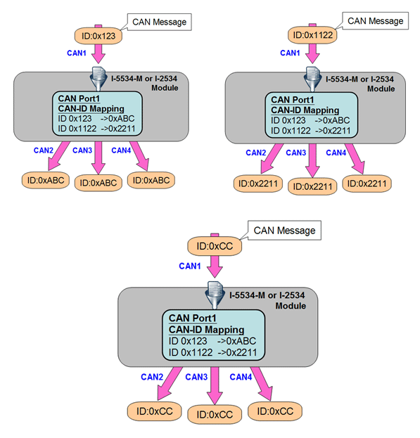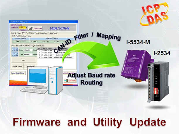 升級版韌體不僅保持原有舊版本功能,如用戶自定義的 CAN 鮑率、CAN 訊息過濾器與路由路徑設置。升級版韌體新加入CAN-ID mapping 機制,用戶可以設置CAN-ID轉換表,更改轉發前的CAN訊息ID。當I-2534或I-5534-M接收到特定CAN-ID後,CAN-ID 依據轉換表改 變相應的CAN-ID,並將其傳送到另一個 CAN 端口。當CAN設備發送相同的CAN報文,I-2534 或 I-5534-M 可以通過 CAN-ID mapping 機制更改為另一個 CAN-ID。