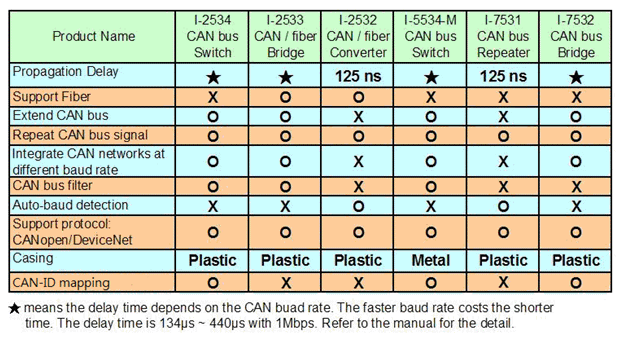 - 下表為泓格科技所有CAN橋接器(bridge)與訊號重置器(repeater)列表:
