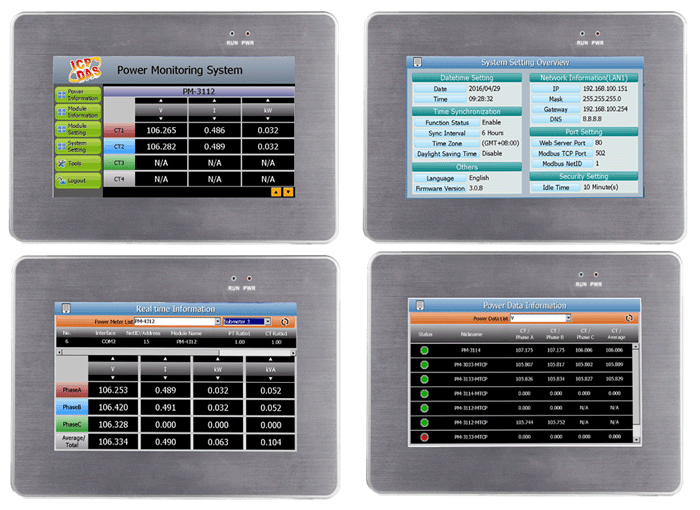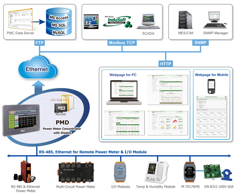 PMD-2201提供7" TFT LCD觸控螢幕,使用者可透過本機端觸控螢幕快速建置電力監控系統並進行電力資訊瀏覽。此外, PMD-2201 也內建網頁伺服器(Web Server),使用者亦可透過網頁瀏覽器(Browser)連接至PMD-2201以進行遠端電力資訊的瀏覽及系統設定。PMD-2201支援標準Modbus TCP/RTU及SNMP通訊協議,可即時傳遞被監控設備的用電資訊與後端SCADA/IT/IoT管理平台以進行用電行為的分析與管控。