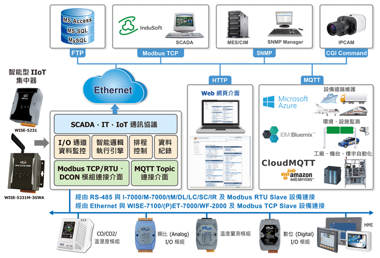 WISE支援多種通訊協議,提供使用者可快速的與SCADA、IT、MES、網管及物聯網系統進行無縫整合。