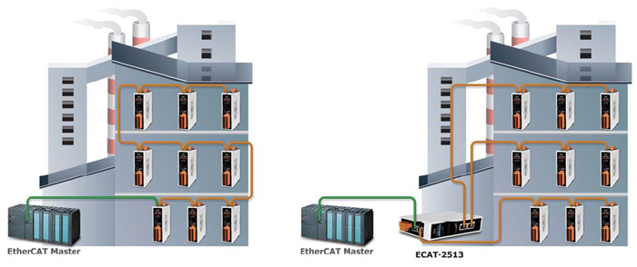 ECAT-2513 是1對3 埠的EtherCAT節點從站模組,能夠使設備經由菊花鏈 (Daisy Chain) 及分支連接讓現場安裝及佈線更加靈活且容易管理和維護。