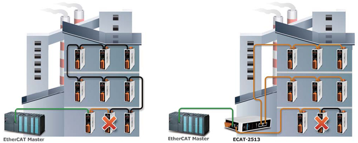 一般單一的菊花鏈 (Daisy Chain) 拓撲,當其中一個節點設備斷線或故障不能運作時,與它同一網域且串連在下面的其它節點設備將無法與主控制器通訊。
