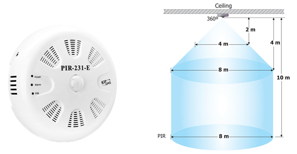 - 簡介:PIR-231系列可以在直徑8公尺、高度10公尺360度的覆蓋範圍內偵測由人體體溫輻射出的紅外線作為室內人體移動偵測用。模組可以設置成當偵測到人體移動時自動開啟照明裝置。模組也內建一個溫溼度感測器可用於量測室內的溫溼度數值或是做為火災示警用。可以選擇RS-485/乙太網等通訊介面,支援DCON和Modbus RTU/TCP協議,可以容易地整合在HMI/SCADA/中央控制系統中。我們提供免費工具程式可以用來設置模組及顯示資料圖表,也可將資料匯出至微軟公司的試算表。