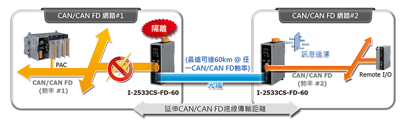 I-2533CS-FD-60模組為CAN/CAN FD (CAN with Flexible Data-Rate) 通訊介面與單模光纖通訊介面的橋接器,能透過單模光纖連結兩個CAN/CAN FD網路。為了解決CAN/CAN FD通訊介面與光纖通訊介面之間的訊號轉換問題,I-2533CS-FD-60模組能夠將CAN/CAN FD介面的訊號,轉換成光纖上的訊號,並透過另外一個I-2533CS-FD-60模組把資料再次還原成CAN/CAN FD介面的訊號。此外,I-2533CS-FD-60模組更具備了三個重要的特性。