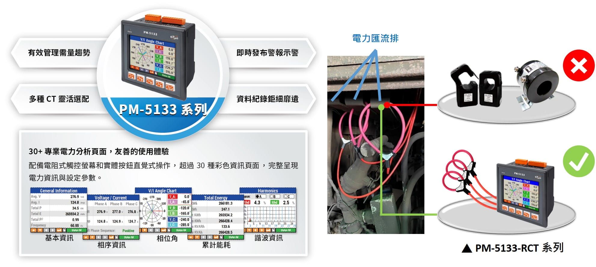 PM-5133-RCTxxxP 是一款專為工業自動化和能源管理設計的觸控式三相智能電表。配備 3.5 吋高解析彩色 TFT 觸控螢幕,使用者可直觀地監視電力資訊並控制需量符合契約容量的要求,滿足碳盤查和 ISO-50001 能源管理需求。