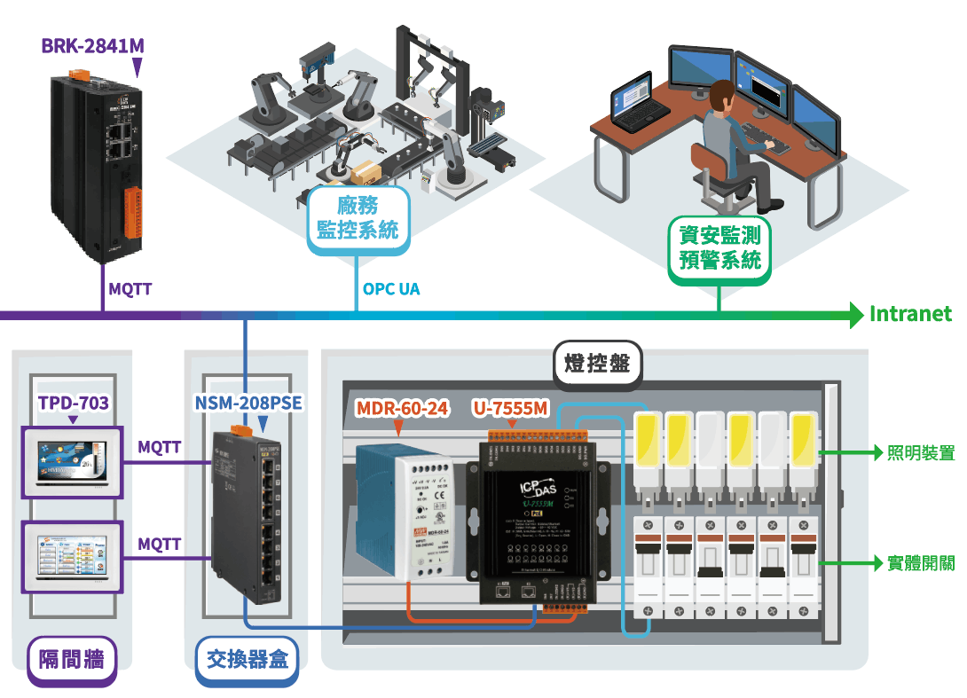 控制核心是U-7555M 模組,模組上的數位輸出與輸入分別結線到照明裝置迴路與照明面板開關的繼電器,此模組也提供邏輯與排程控制,成為可單獨運作的智慧燈控模組。U-7555M 提供三種高安全性的資料交換協議,OPC UA、MQTT 與Restful API(https),透過這幾種協議與廠務監控系統整合可大幅降低資安風險。