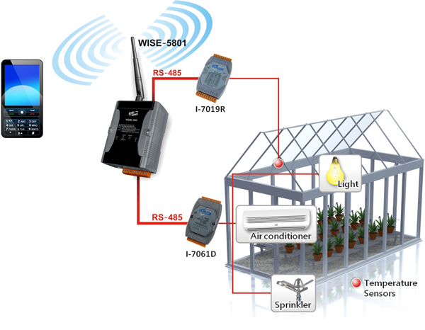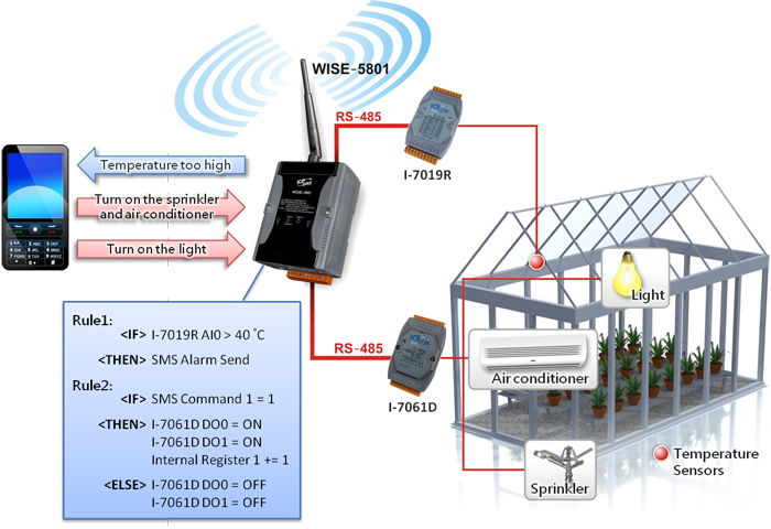 WISE-5801(-MTCP) and WISE-523xM-3GWA/4GE/4GC is equipped with SMS alarm message notification function. It allows to include SMS alarm sending action into logic rules to send a pre-set SMS message to related personnel when an event occurs. In addition, WISE-5801(-MTCP) and WISE-523xM-3GWA/4GE/4GC allows to receive the SMS commands sending by specific phones numbers to perform tasks such as real-time channel monitoring, channel data modification and logic rules execution (triggered by SMS), etc.