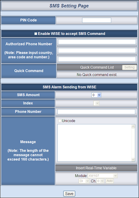 Enter the content in the “Message” field. If the Unicode mode is adopted, the length of the content cannot exceed 70 characters. If the Unicode mode is not selected (will support English characters only), the length of the content limit is 160 characters. SMS Alarm provides an encoded string for you to add current I/O channel data or Internal Register data into SMS Alarm message. To make it easy to add the encoded string, WISE provides “Real-time variable editor”.