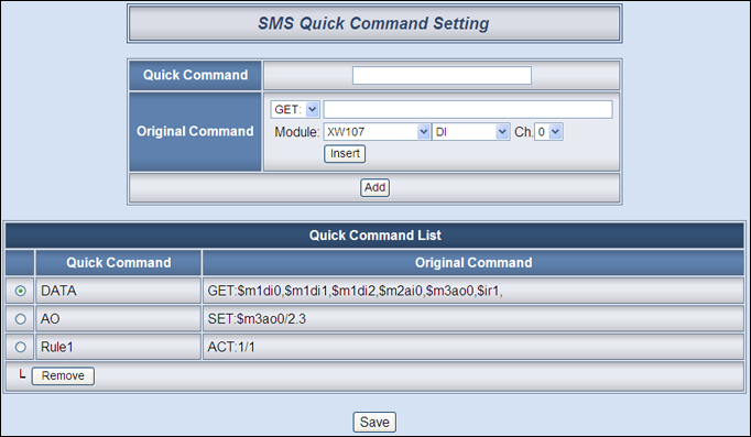 Input a simple, self-defined command string in the “Quick Command” field, and then edit the original SMS command by selecting the command type and I/O channel from the dropdown list (shown as figure above) in the “Original Command” field . Press “Add” button after finishing the SMS command setting; the SMS Quick command and its corresponding SMS Original Command will be shown in the Quick Command List field. Now you can send the SMS Quick command string “DATA” (shown as the Quick Command List in the figure above) to WISE-5801, after WISE-5801 receiving the “DATA” command, it will execute its original command “GET:$m1di0,$m1di1,$m1di2,$m2ai0,$m3ao0, $ir1,’ to retrieve the DI0/DI1/DI2 channel values of I/O module (Address=1), the AI0 channel value of I/O module(Address=2), the AO0 channel value of I/O module(Address=3) and the IR0(Internal Register 0) value, and then will send back all the values to you.
