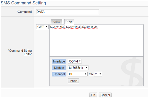 Input a command string in the “Command” field as the nickname for the original corresponding command in the “Command String Editor” section. In the “Command String Editor” section, select the command type to be “GET” (retrieve real-time channel data) or “SET” (modify channel data) from the dropdown list. For “GET” command; It provides an encoded string for you to add current I/O channel data, power data or Internal Register data into SMS command. To make it easy to add the encoded string, WISE provides “Real-time variable editor”. For “SET” command, select “Source”, “Module” and “Channel” from the dropdown list, and then set the “Value” to be modified (you can also leave the “Value” field blank, and input the value later according to requirement in real-time when send back the SMS Command).