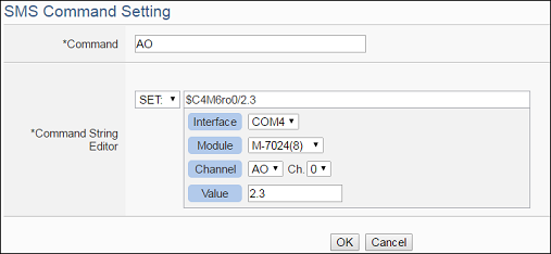 For “SET” and “ACT” SMS Command, there are two options for SMS Quick Command edition. The first option is as the second listed Quick Command on the Quick Command List (shown as figure above). The “AO” quick command replaces the original command ”SET:$m3ao0/2.3”, when WISE-5801 receive the SMS Quick command “AO”, it will set the AO channel 0 of the I/O module(Address= 3) to be 2.3. The second option is to edit the SMS Quick command “AO” to be ”SET:$m3ao0” as the SMS Original command string. In this format, when use the “AO” Quick command, it is required to append a value to the Quick command string, such as: “AO/2.3”. WISE-5801 will set the AO channel 0 of the I/O module(Address=3) to be 2.3. In this way, the output channel value can be modified flexibly as any other values by sending command like: ”AO/5.6”, ”AO/7.8”.