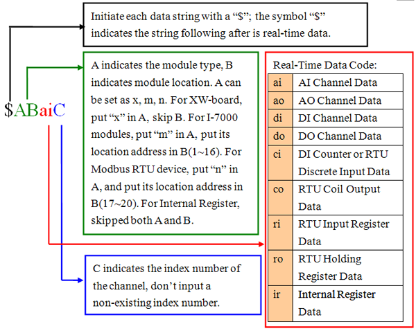 GET:$xdi0,$m1ai2,$n18ro3 (Inquires the value of DI0 on XW- Board, the value of AI channel 2 on I-7000 that locates at address 1 and the value of Holding Register address 18 on Modbus RTU device that locates at address 3.) |
