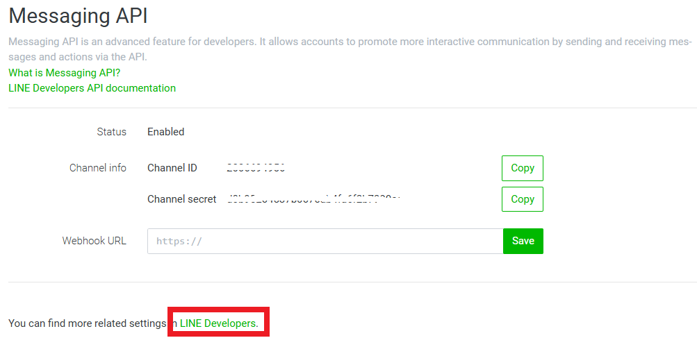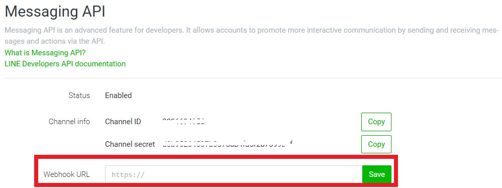 Once the official account is set up, return to the “Messaging API” page, input the following URL in the “Webhook URL” field, and click the “Save” button.