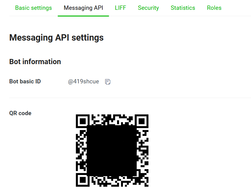 Navigate to the “Messaging API” page, use the QR code on this page to add this official account as a friend and create a chat room.