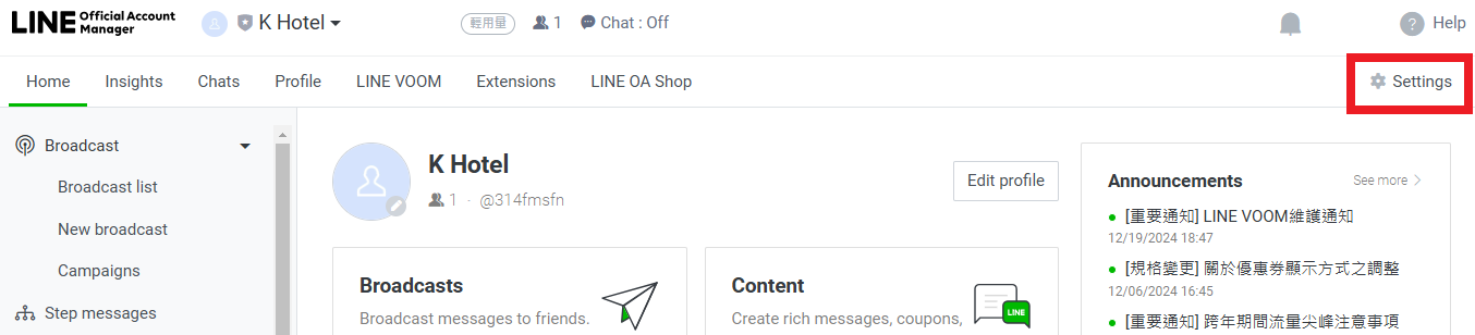 Chat rooms are the push targets for LINE Messaging API messages. You can add or manage chat rooms through the settings page. The chat room settings page is as follows: