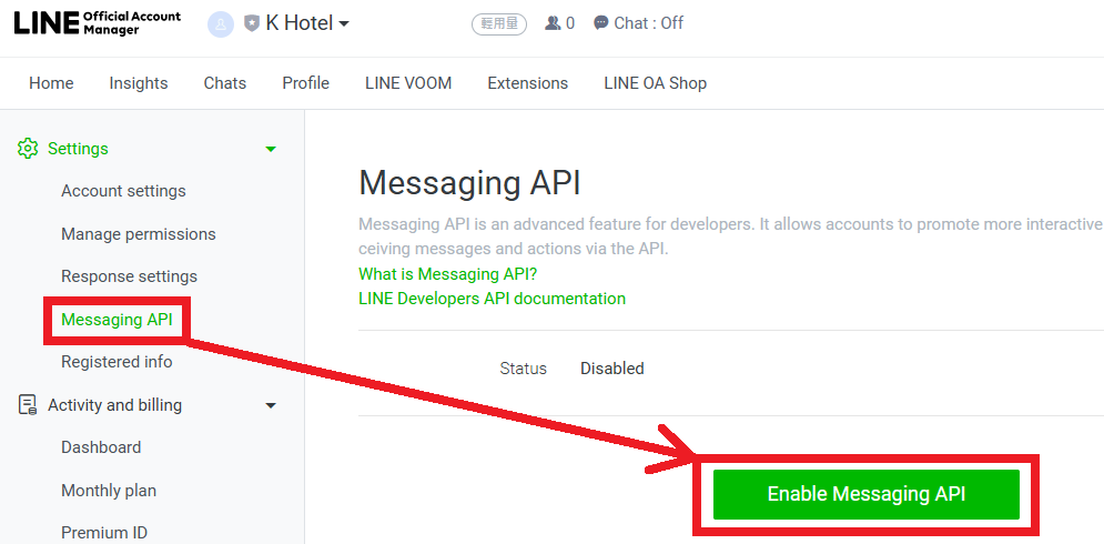 Click on “Messaging API” on the left, and then click “Enable Messaging API”.