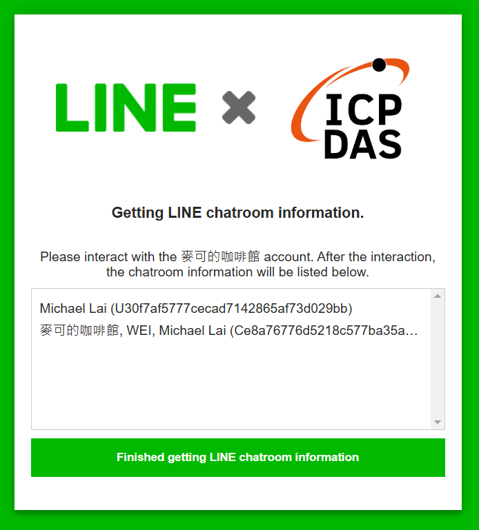 Use your phone to chat in the chat room with the official account, and WISE will record the chat room IDs that have been engaged. After recording all chat room IDs, click the “Finished getting LINE chatroom information” button to stop recording chat room IDs.