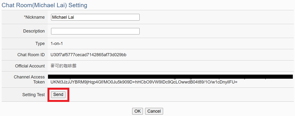 You can select a chat room and click the “Setting” button to enter the chat room settings page. In addition to setting the chat room's description, you can also click the “Send” button, and WISE will send a test message to the chat room.