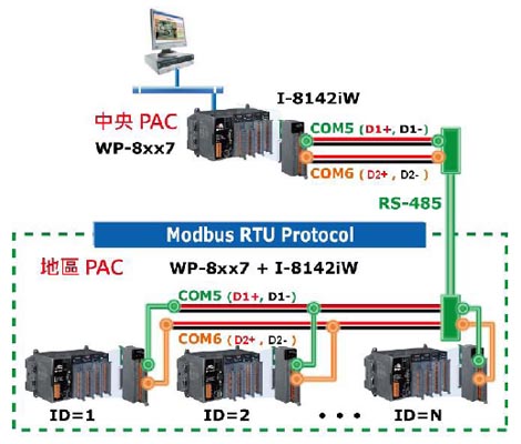 此方式 中央控制站的控制器 為 Modbus RTU Master, 地區控制站的控制器 為 Modbus RTU Slave, 中央控制站使用2組