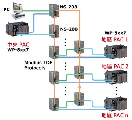 此方式 中央控制站的控制器 為 Modbus TCP Master, 地區控制站的控制器 為 Modbus TCP Slave, 中央控制站使用2組