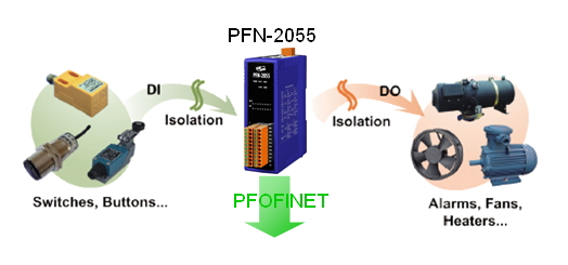 The PFN-2055 is specially designed for PROFINET IO device. It has 8-channel isolated digital inputs and 8-channel isolated digital outputs, and is suited in various industrial applications. You can access and configure it by using the GSDML file in any PROFINET Engineering tool.