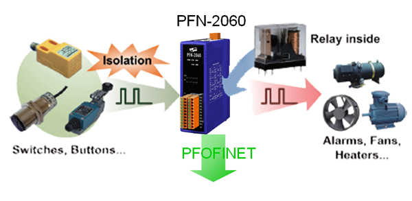 The PFN-2060 is specially designed for PROFINET IO device. It has 6-channel isolated digital inputs and 6-channel relay outputs, and is suited in various industrial applications. You can access and configure it by using the GSDML file in any PROFINET Engineering tool.