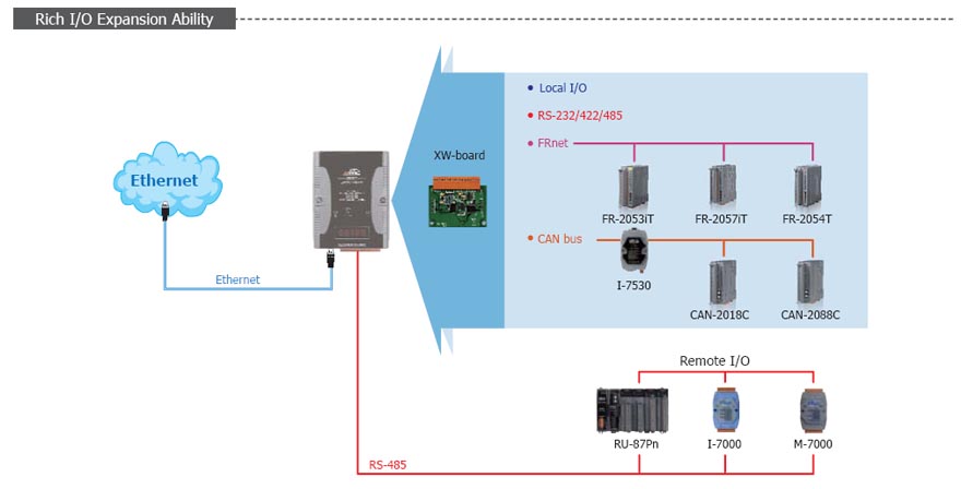 For hardware expansion, it also supports an I/O expansion bus. The I/O expansion bus can be used to implement various I/O functions such as D/I, D/O,A/D, D/A, Timer/Counter, UART, and other I/O functions. Nearly all kinds of I/O functions can be implemented by this bus. But the bus can support only one board. There are more than 10 boards available for £gPAC-5000 series, you can choose one of them to expand hardware features. more... |