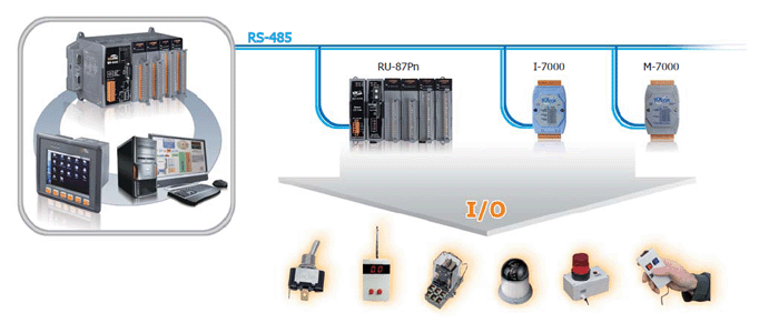 RU-87Pn series is a remote intelligent I/O expansion unit that used to expand I-87K series I/O modules over the RS-485 for industrial monitoring and controlling applications. There are more than 50 I/O modules supported with the unit, including analog input/output, digital input/output, and counter/frequency I/O modules.