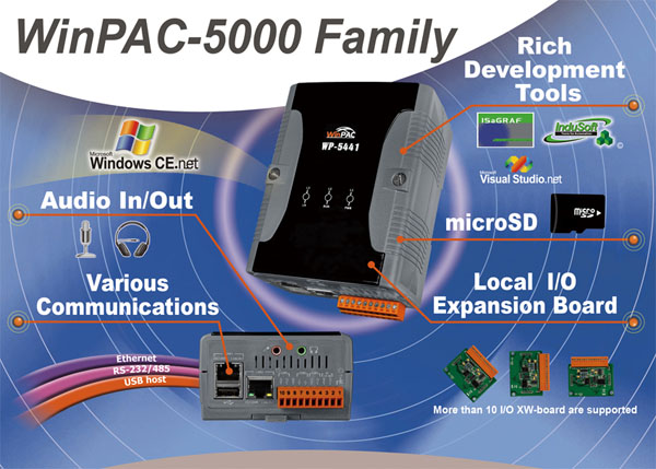 The ICP DAS WinPAC-5000 Series is the new generation PAC (Programmable Automation Controller). It is equipped a PXA270 CPU (520 MHz) running a Windows CE.NET 5.0 operating system, various connectivity (VGA, USB, Ethernet, RS-232/485) and I/O expansion bus.